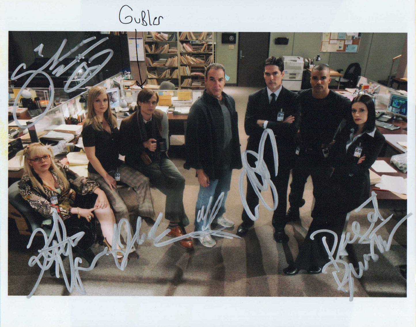 Criminal Minds 8x10 Photo Cast Signed by Matthew Gray Gubler, Thomas Gibson, Mandy Patinkin, Shemar Moore, Paget Brewster, Kirsten Vangsness, and A. J. Cook