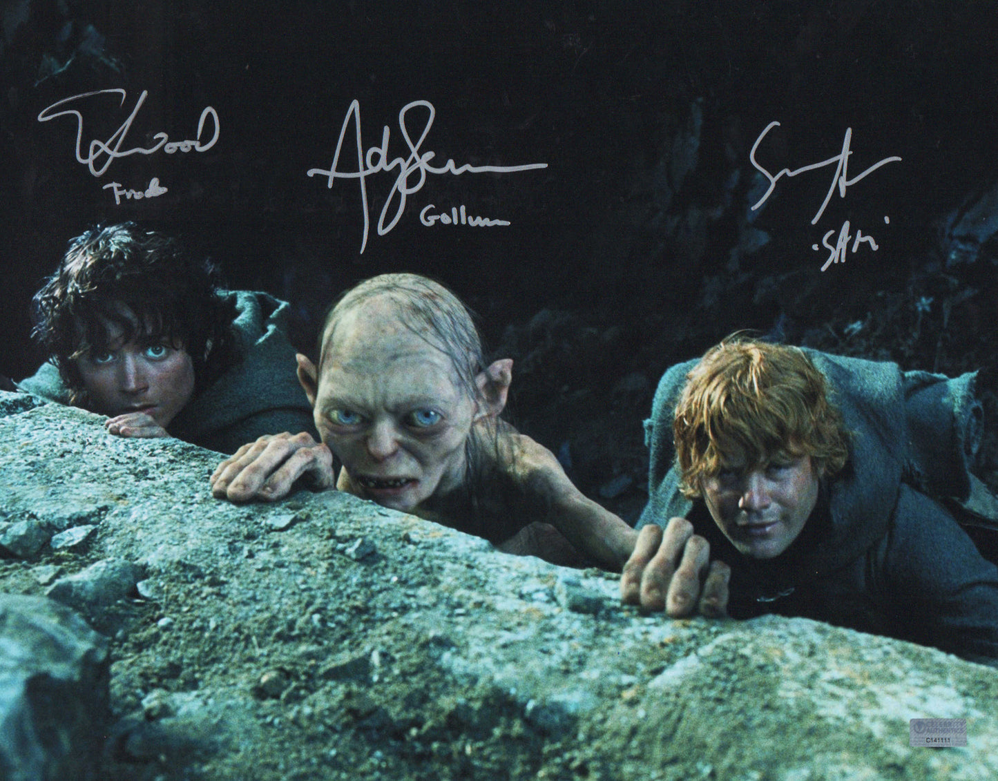 Elijah Wood as Frodo Baggins, Andy Serkis as Gollum, & Sean Astin as Samwise Gamgee in The Lord of the Rings: The Return of the King (Celebrity Authentics) Signed 11x14 Photo with Character Names