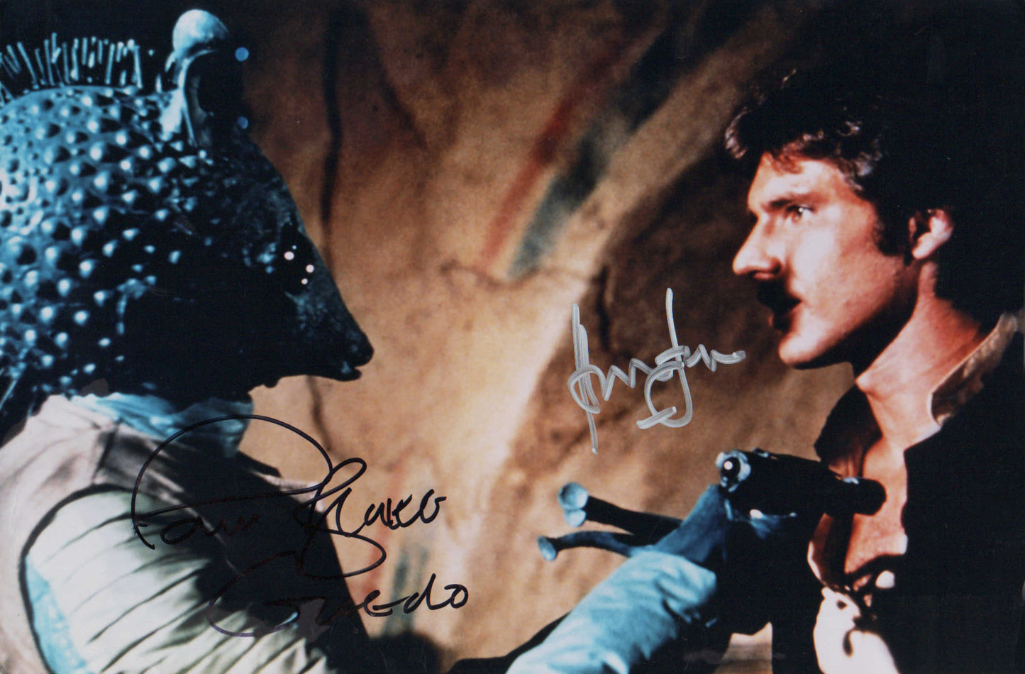 Harrison Ford as Han Solo and Paul Blake as Greedo in Star Wars: A New Hope Signed 8x12 Photo with Character Name