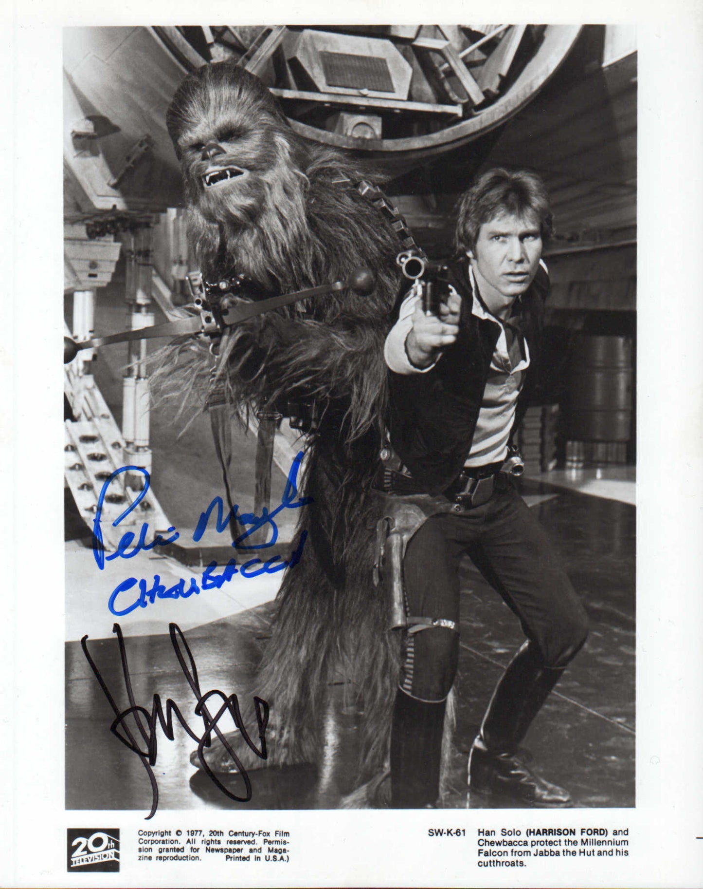Harrison Ford as Han Solo & Peter Mayhew as Chewbacca in Star Wars: A New Hope Signed 8x10 Press Photo