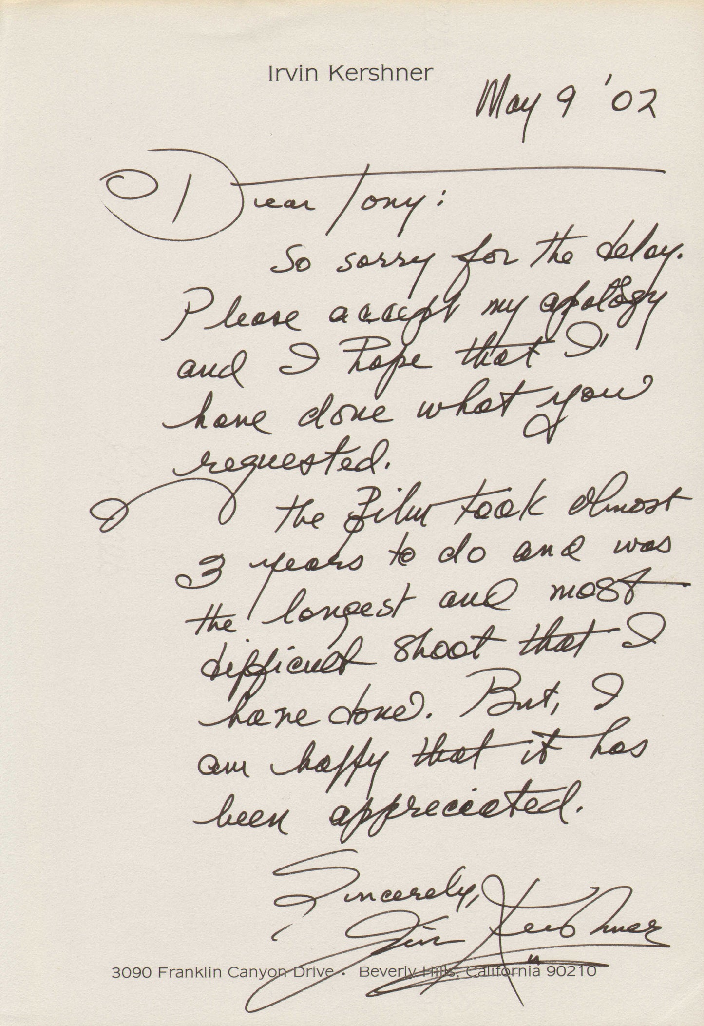 Irvin Kershner Director of Star Wars: The Empire Strikes Back Signed 7x10.5 Handwritten Letter
