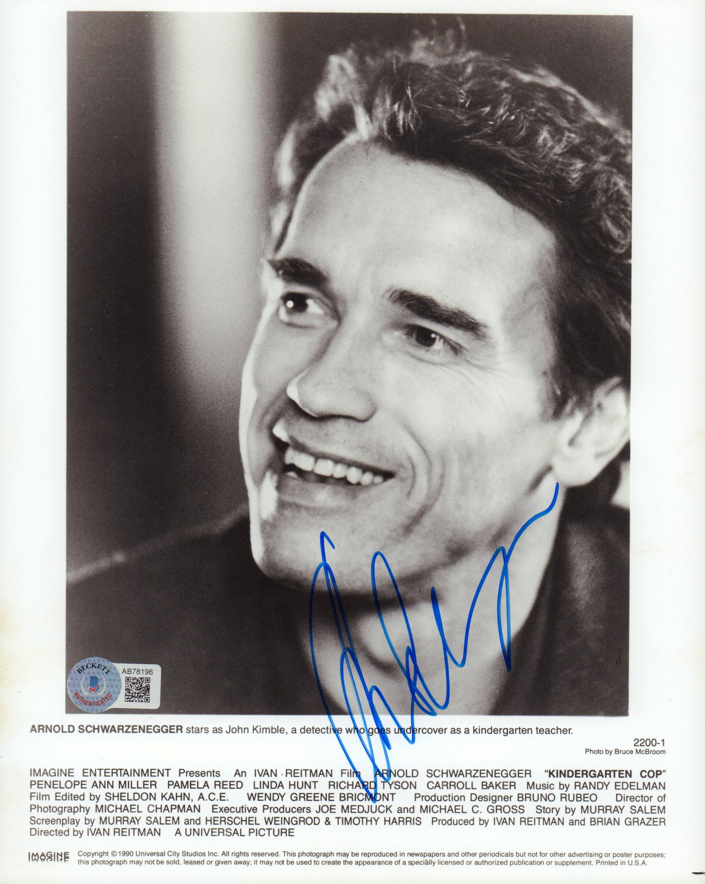Arnold Schwarzenegger as Detective John Kimble in Kindergarten Cop (Beckett) Signed 8x10 Press Photo