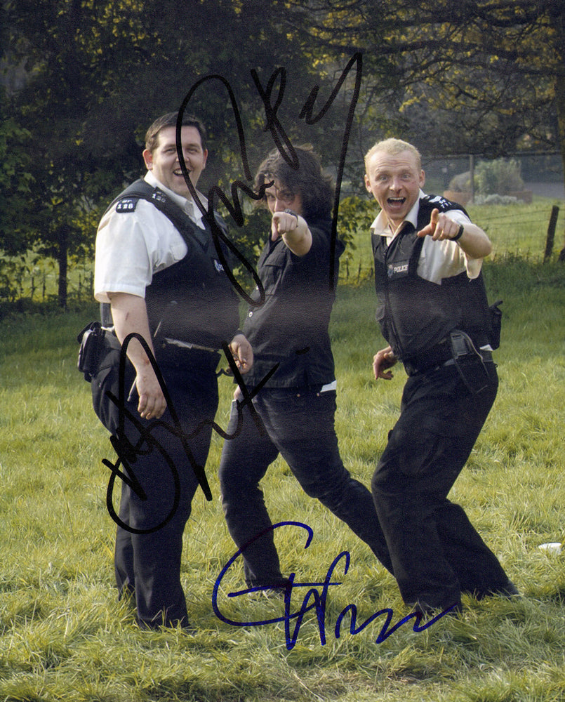 Simon Pegg as Nicholas Angel, Nick Frost as Danny Butterman, & Edgar Wright Director of Hot Fuzz Signed 8x10 Photo