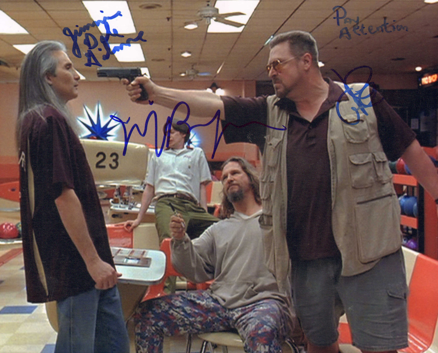 Jeff Bridges as Jeffrey "The Dude" Lebowski, John Goodman as Walter Sobchak, & Jimmie Dale Gilmore as Smokey in The Big Lebowski Signed 8x10 Photo with Quote