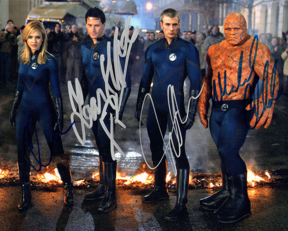 Ioan Gruffudd as Reed Richards / Mister Fantastic, Jessica Alba as Sue Storm / Invisible Woman, Chris Evans as Johnny Storm / Human Torch, & Michael Chiklis as Ben Grimm / The Thing in Fantastic Four Signed 8x10 Photo