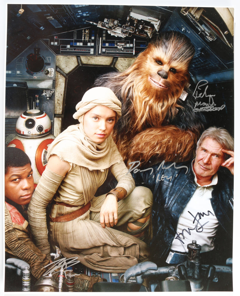 Star Wars: The Force Awakens (Beckett Witnessed) 16x20 Photo Cast Signed by Harrison Ford, Peter Mayhew, Daisy Ridley, & John Boyega with Character Names