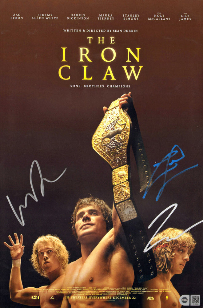 The Iron Claw 12x18 Mini Poster (SWAU) Cast Signed by Zac Efron, Jeremy Allen White, & Harris Dickinson