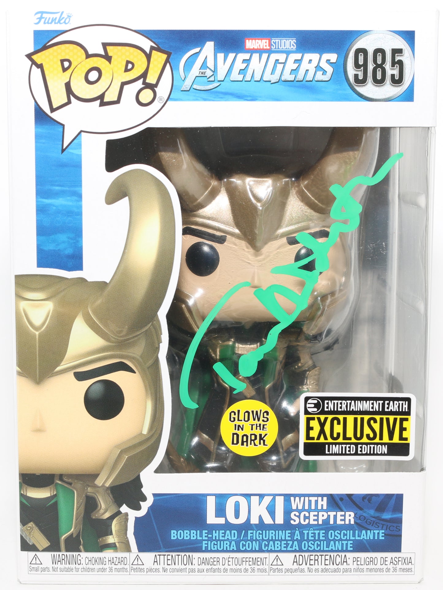 Tom Hiddleston as Loki with Scepter in Avengers GITD Entertainment Earth Exclusive (SWAU) Signed Funko POP! #985