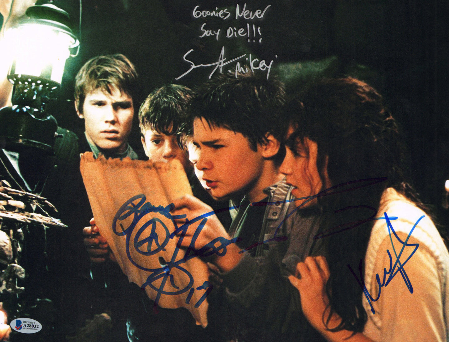 The Goonies 11x14 Photo (Beckett) Cast Signed By Sean Astin, Corey Feldman, Josh Brolin, & Kerri Green with Character Names & Quote