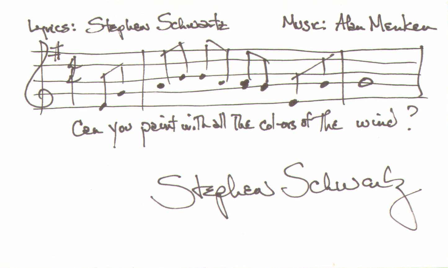 Stephen Schwartz Composer & Lyricist Signed 3x5 Index Card with AMQS Handwritten Musical Notes & Lyrics of Colors of the Wind from Pocahontas