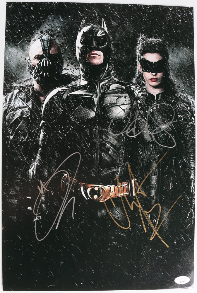 Christian Bale as Batman, Anne Hathaway as Catwoman, & Tom Hardy as Bane in The Dark Knight Rises (JSA) Signed 12x18 Mini Poster