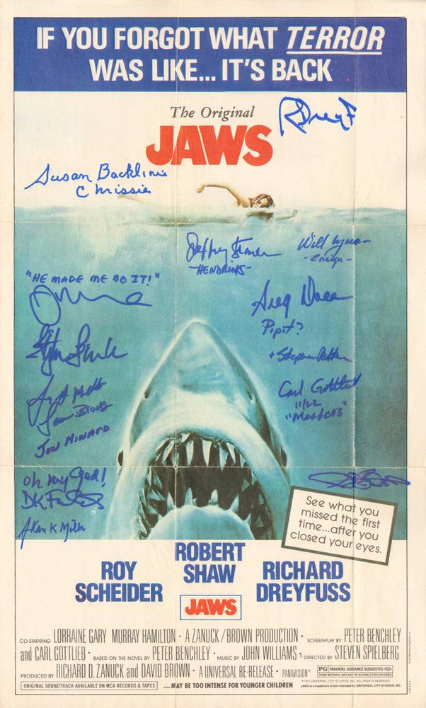 Jaws 12x20 Mini Poster Cast Signed by Richard Dreyfuss, Susan Backlinie, Jonathan Searle, Steven Searle, Jay Mello, Jon Minard, Dorothy Fielding, Jeffrey Kramer, Bill Wyman, Gregory S. Dole, Steven Potter, & Others with Character Names & Quotes