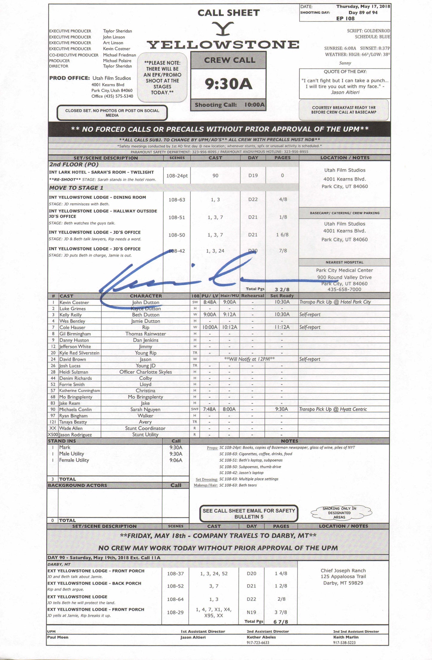 Kevin Costner as John Dutton in Yellowstone Signed Call Sheet