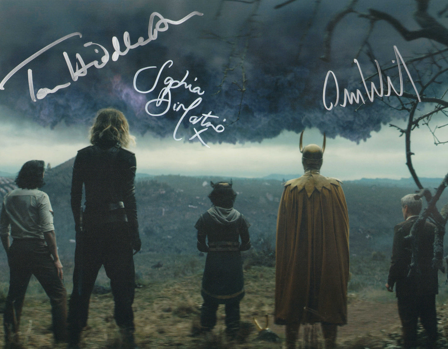 Tom Hiddleston as Loki, Sophia Di Martino as Sylvie, & Owen Wilson as Mobius M. Mobius in Loki Signed 11x14 Photo